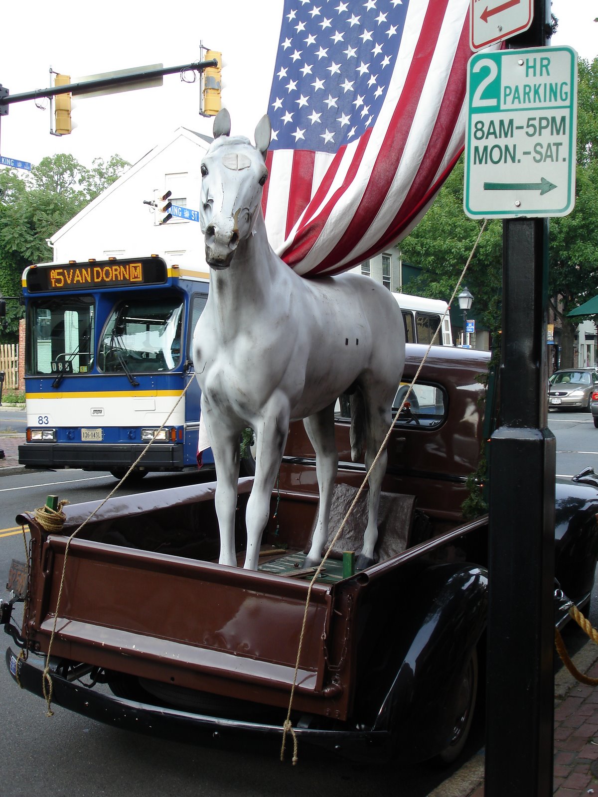 Today was Alexandria’s 2??th Birthday! I got off at the King Street Metro and began walking towards the Water. I made it about 6 blocks and stopped to look into an Ethiopian Gift Shop where I bought some new gold earrings. Then I walked another 8 blocks and on my way, I ran into a horse in a truck.