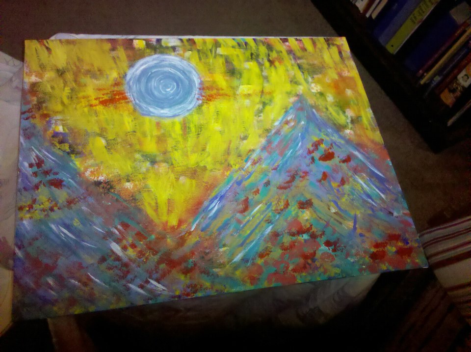 I decided to throw in a random blue triangle. Then a purple one. Then I decided to patch in some yellows. Then red. At about 9pm, I had this strange urge to paint something big and yellow above the triangles. I liked swooping. So I just swooped. And swooped. I swooped in the triangles. I decided I wanted to do something between the triangles. But I couldn’t imagine what. I started to dot paint in purple, blue and green. I let the dots sit for a bit then took my thinnest brush and swirled. I swirled until everything mixed together in this circle. Then I swirled in white. Then I dabbed the sides with red clouds.