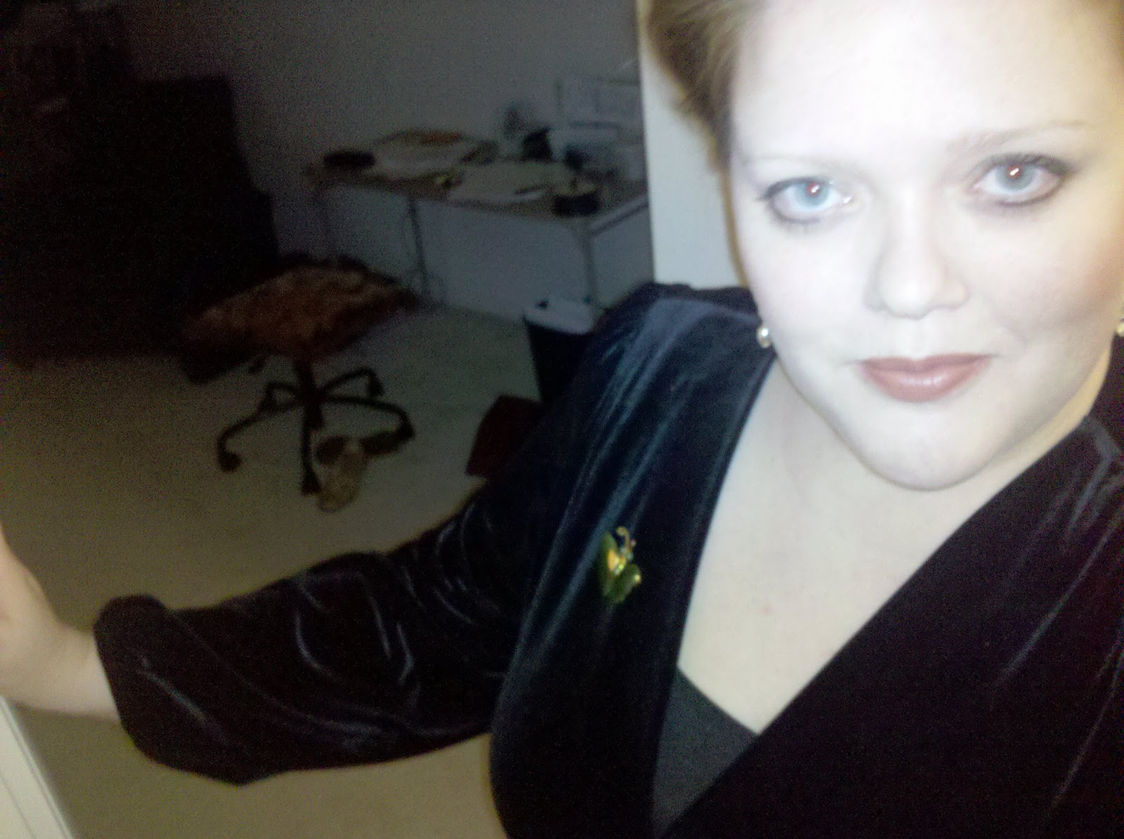 (hair done up in fancy curls, make-up, wearing my great-grandmother’s jade necklace…)