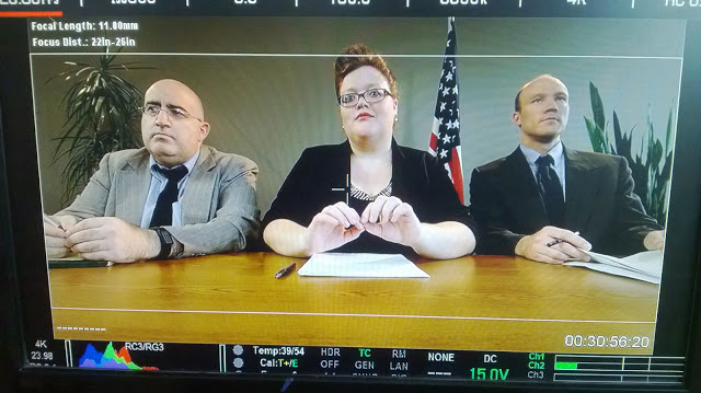 If you look at our faces, you’d never guess that it was 103 degrees with hot lights from the film shining on us. Kudos to make-up artist Elise Hanson for standing by with powder, tissue, and hairspray. Also, I had a bottle of cold water down my back.