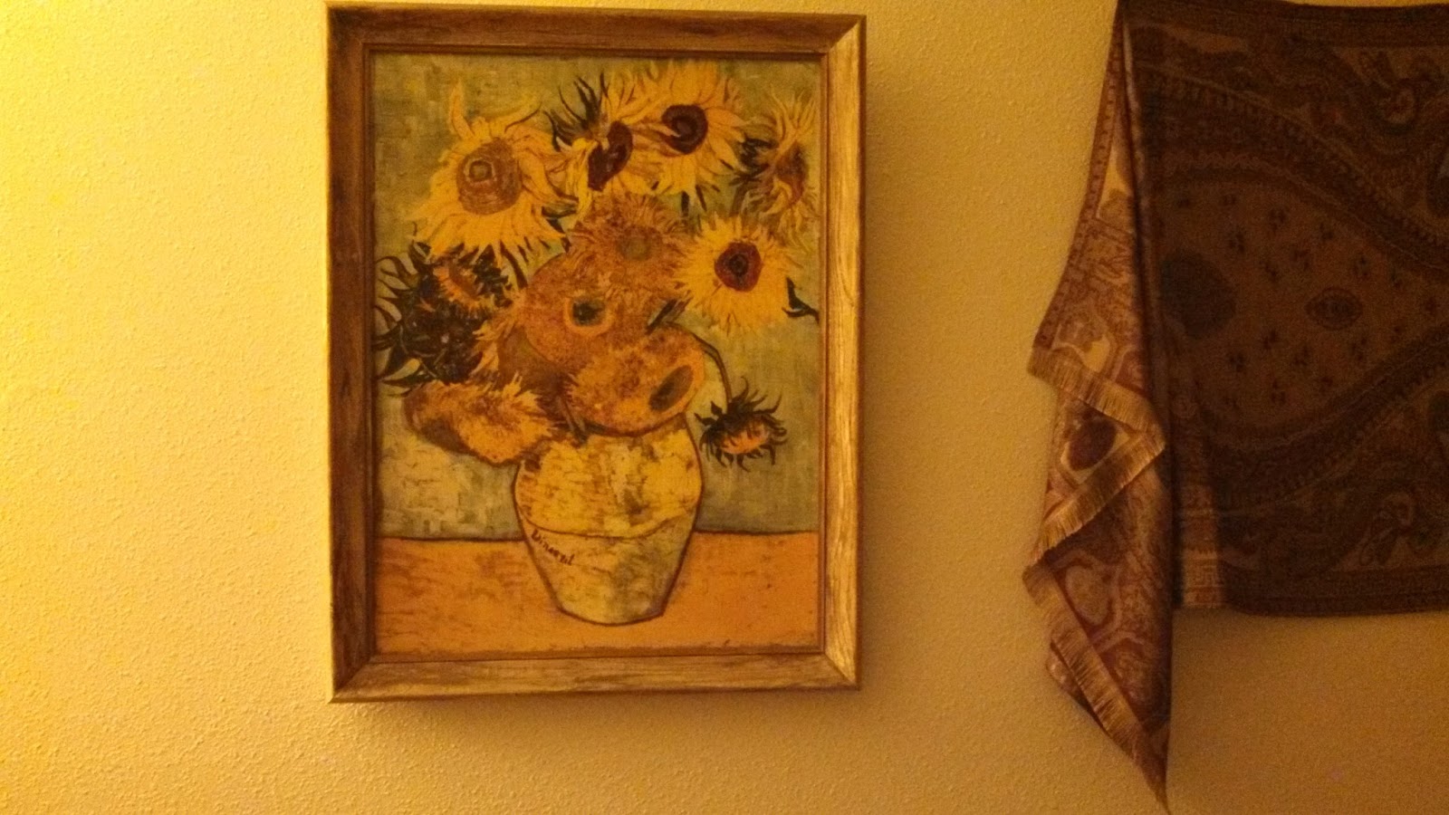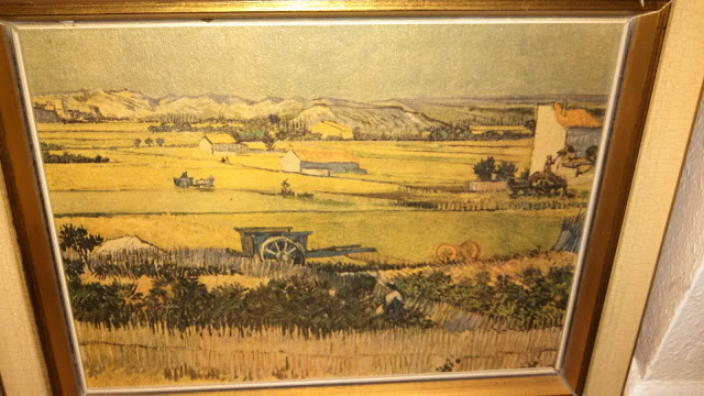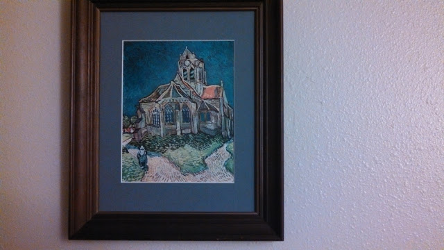 The paintings are on canvas. They are beautiful replicas of the originals. (My grandma is a poor widow–so no original Van Goghs here) She found the copies and framed them herself over 50 years ago and has had them with her in every home.