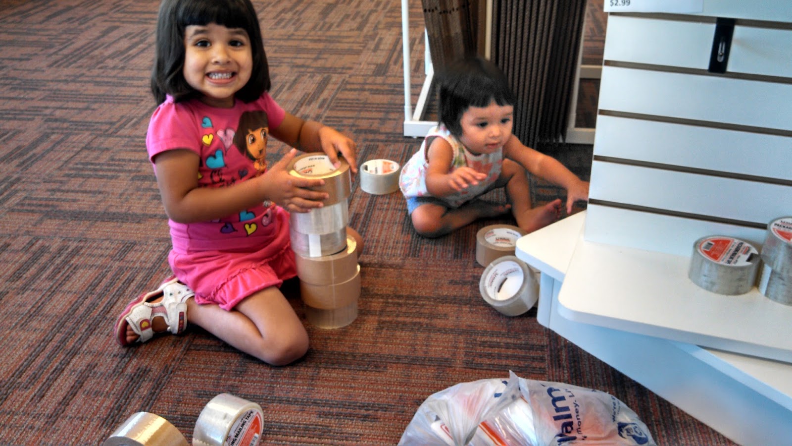 I was helping to get a nice family a storage unit, processing the paperwork, talking codes and phone numbers–and I look over and see these two little Dora lookalikes playing blocks with my packing tape! It was so cute! Who needs toys when you’ve got these super stackable rolly rolls of tape?