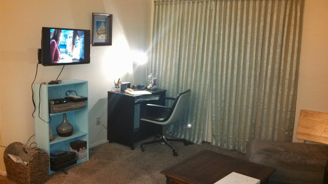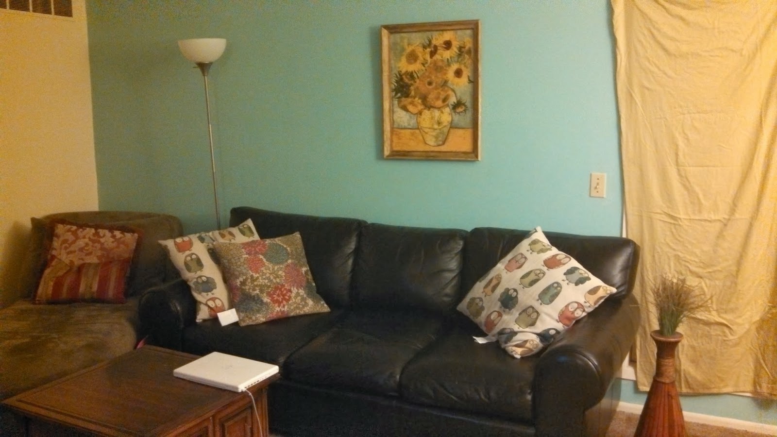 This is my living room. I have a sheet covering up the covered glass window… but it’s a nice sheet! The painting of Van Gogh’s Sunflowers was given to me by my grandmother. She had it in her homes all over the world for over 50 years. It is wonderful to be able to hang it in my living room today.