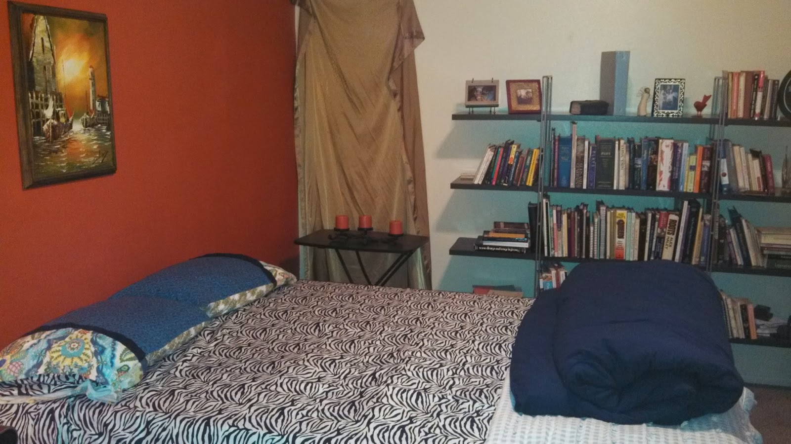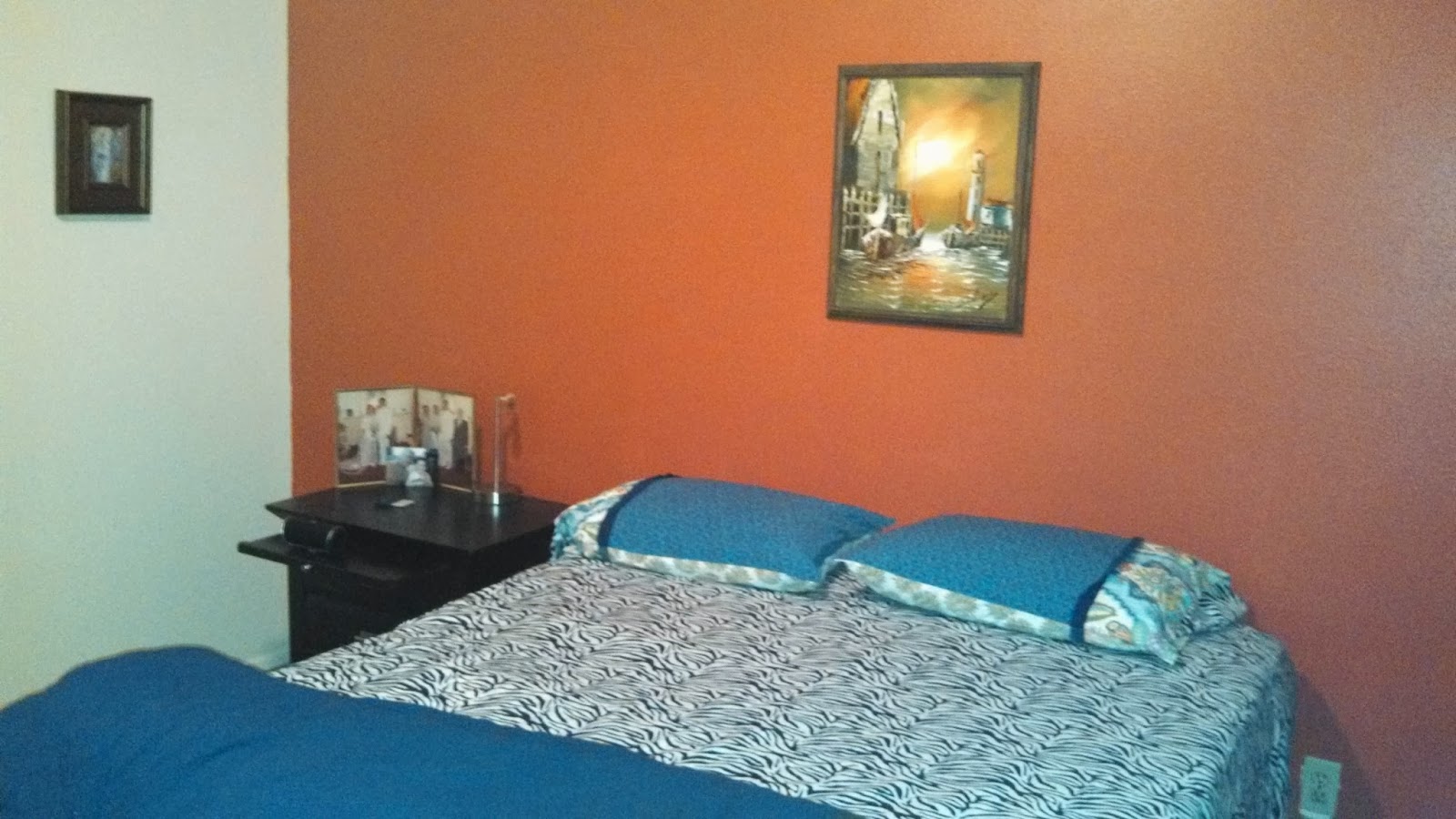 This is my bedroom. Zebra sheets and the flaming orange wall and the painting of the ships at sunset. My friend Christi made the pillow cases.
