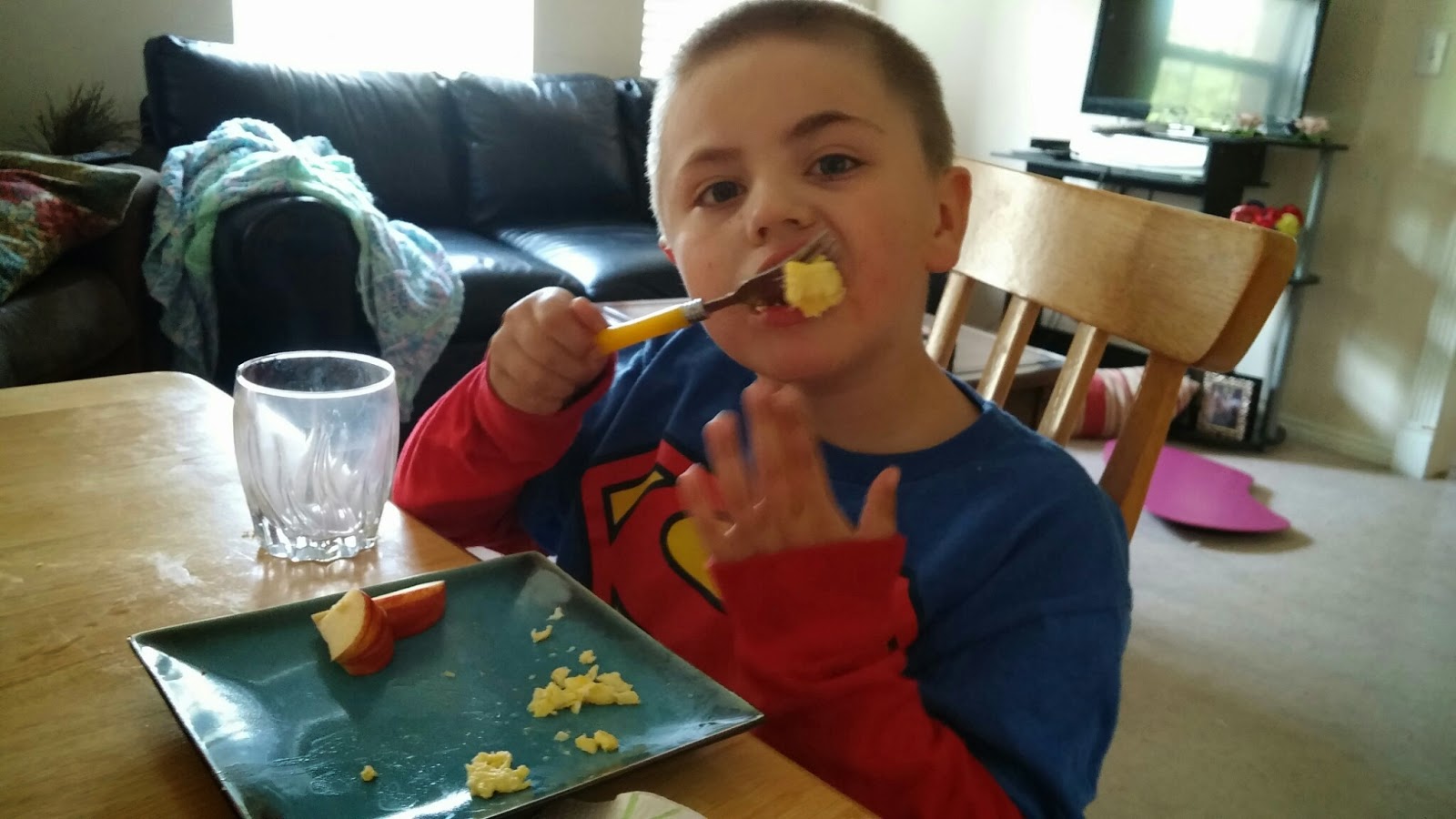 Becoming a mom has been very fun. This kid is hilarious. This morning, we ate eggs and an apple. And of course, chocolate milk.