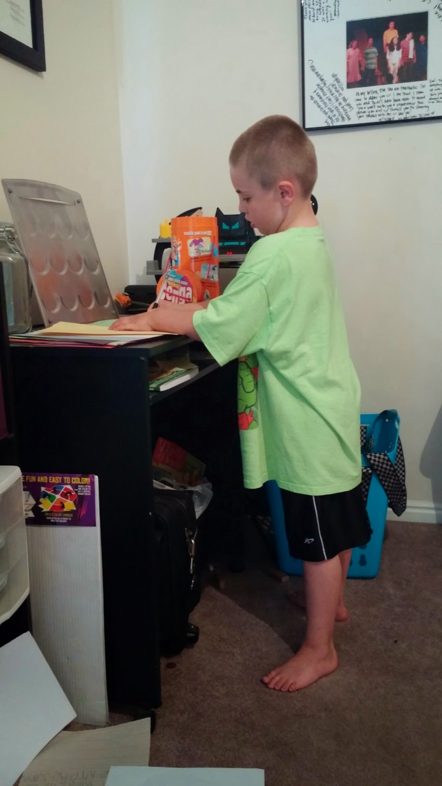Here he is busy at work at his desk. He created two vampires using staples, scissors, paper, and markers. I told him, “That’s so neat!” He replied, “And CREATIVE!”