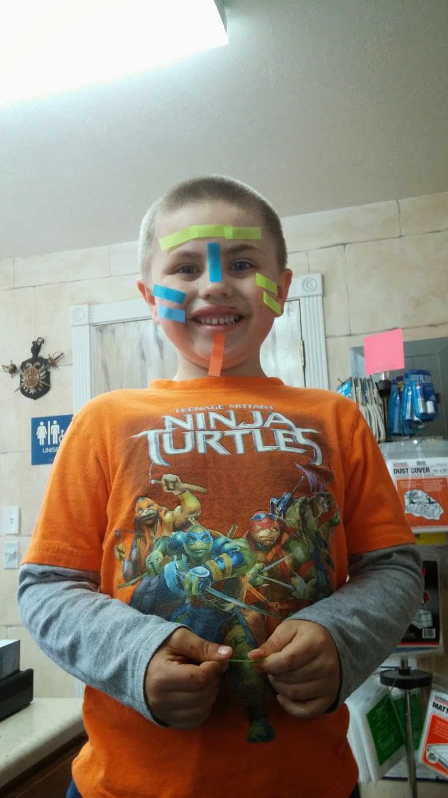 Last week, he got into the office supplies upstairs and decorated himself accordingly.