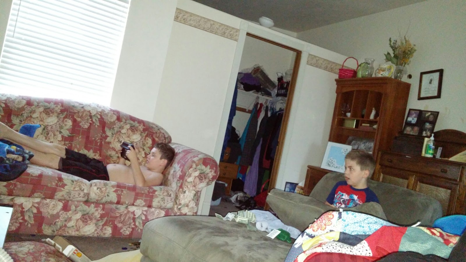 At the end of the night, Daniel whacked his head on the bunk beds and knocked a couple of baby teeth loose. We agreed that both boys could sleep with us in our room, and they both cuddled on couches to watch Never Ending Story.
