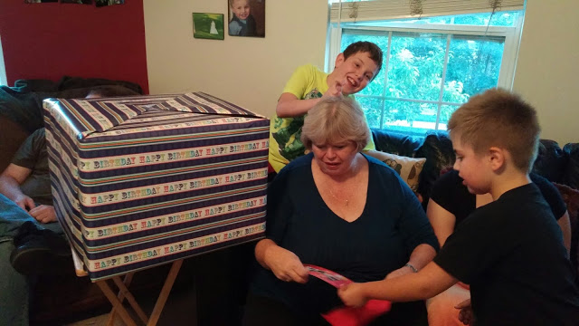| Grandma opening up her gifts from Daniel and Jaxon. |