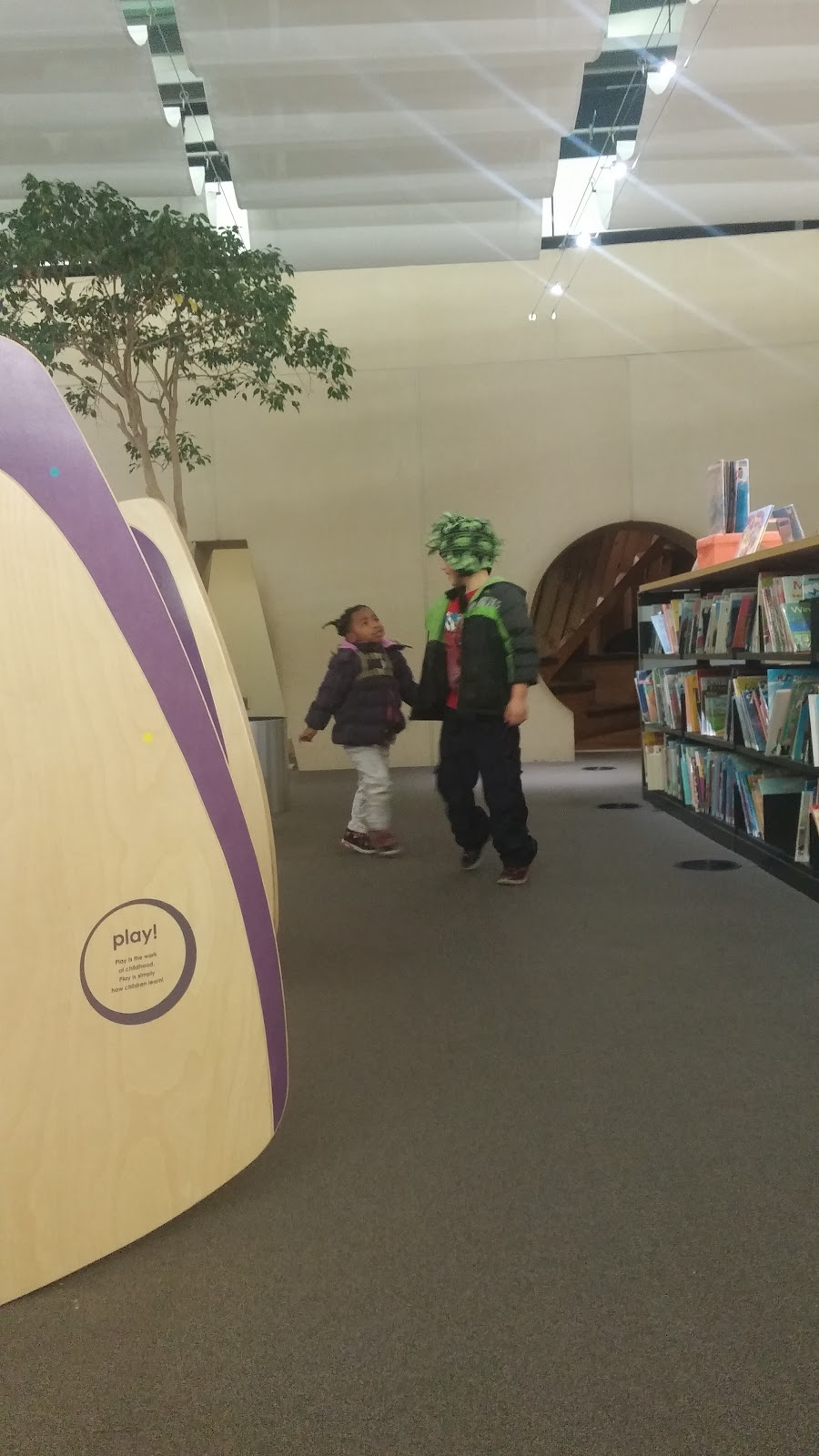 We went down the kids section on the 1st floor, and Daniel found a friend named Maggie. She insisted they play. And he loved it! They ran around all the nooks and crannies they have designed for kids, playing hide and seek, and pretending they were in a castle. She kept trying to make him the scary dragon, but he wanted to be the cool prince.