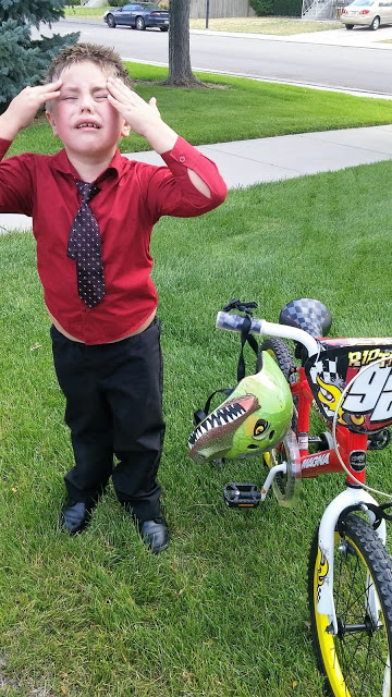 According to Google Maps–we live 1.2 miles from the church building. This is what he looked like after riding his bike those 1.2 miles.